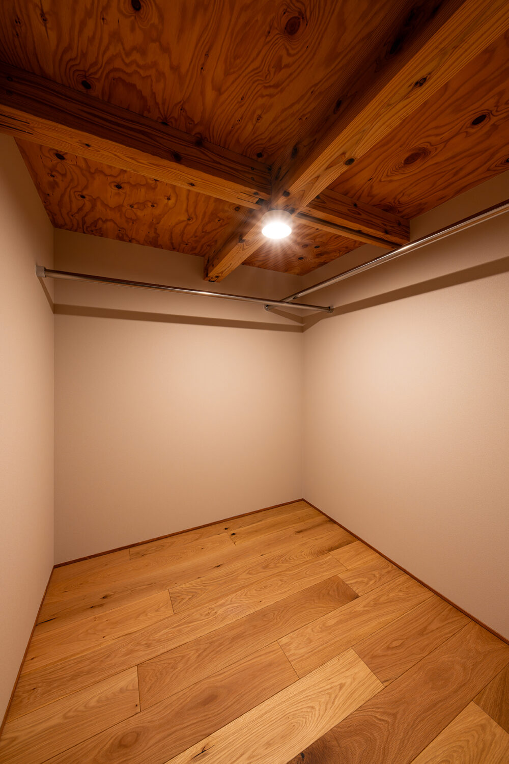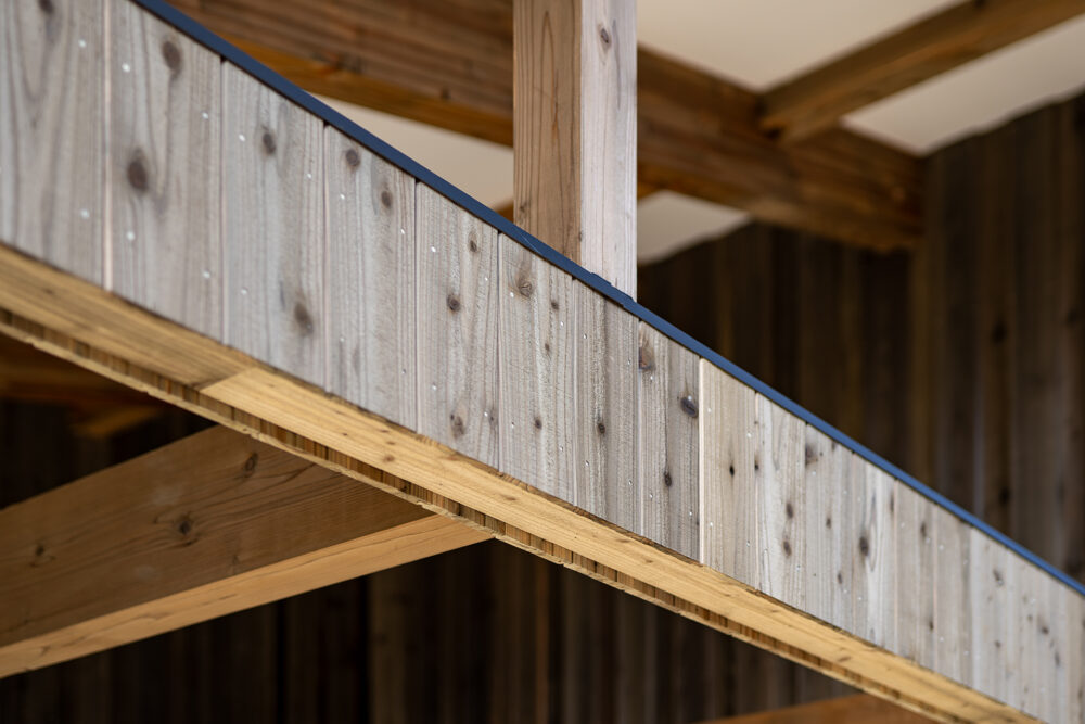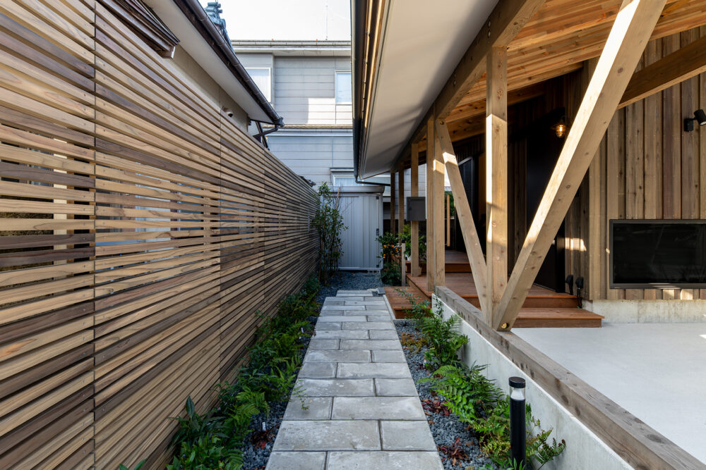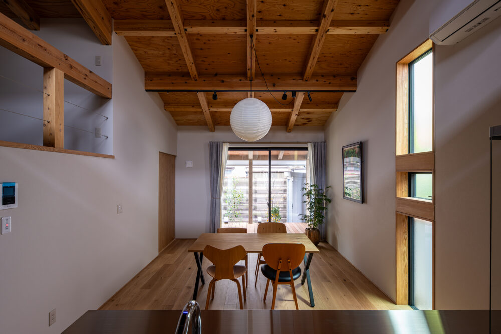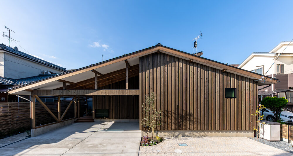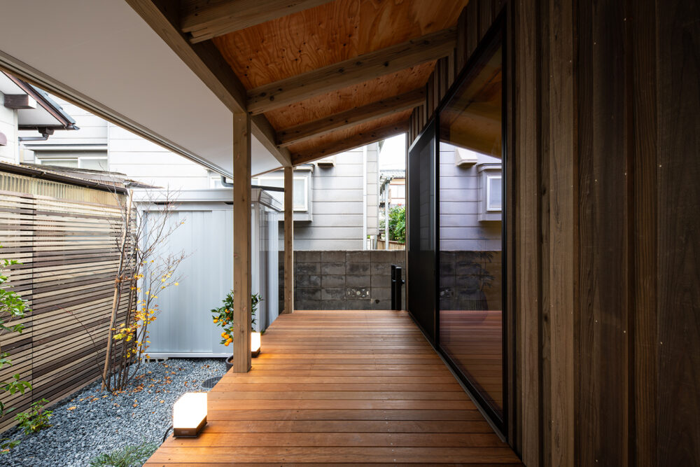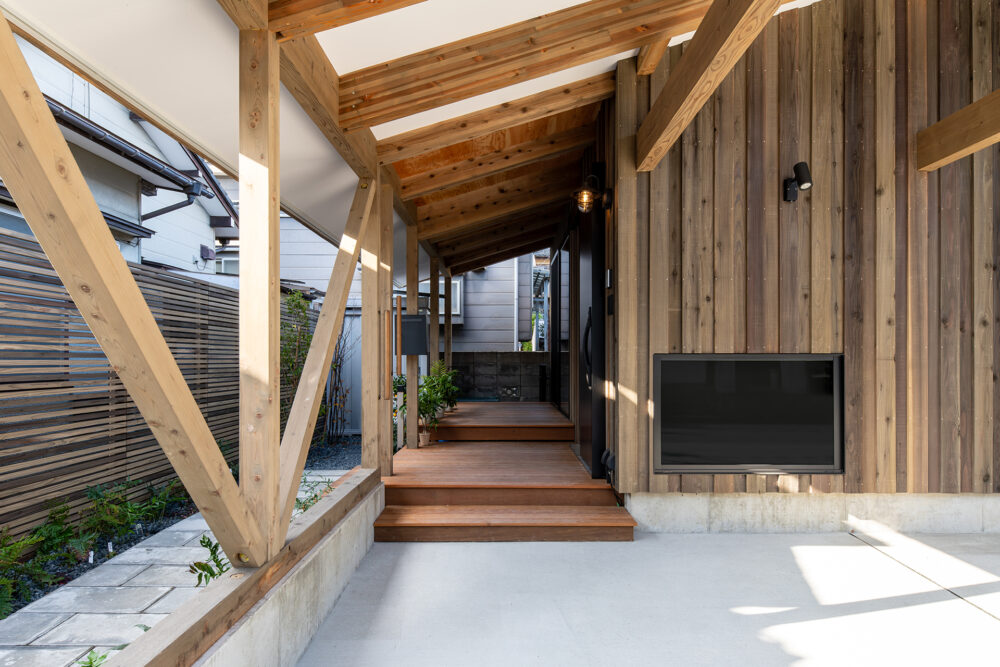 深い軒に包み込まれるウッドデッキと、登り梁が描くのびやかな天井架構。