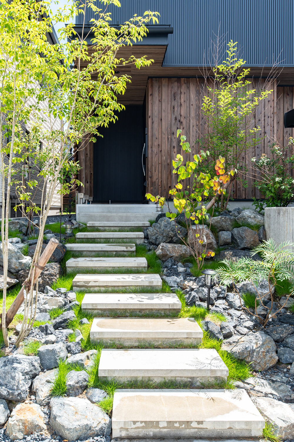 リビングと一体的に繋がる広いウッドデッキが特徴の庭園。敷地の奥に建物で囲う事で外部からの独立性を高めた心地よい空間。